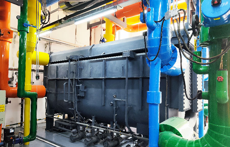 制冷系统采用3台450RT高效电制冷离心机组运行,2台450RT蒸汽溴化锂机组作为备用系统,是国内首个A类机房引入溴化锂机组的机房,首次实现双能源供给,互为备用。机组可以实现快速切换,或断电快速重启,时间:01分15秒冷机进入待机模式,1分50秒进入运行模式。